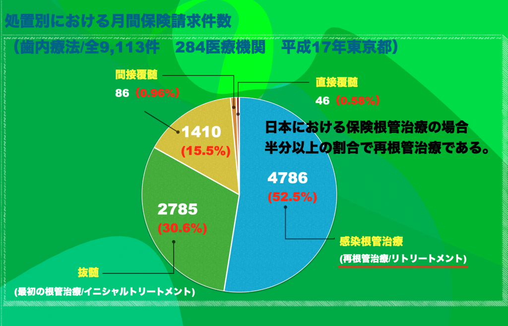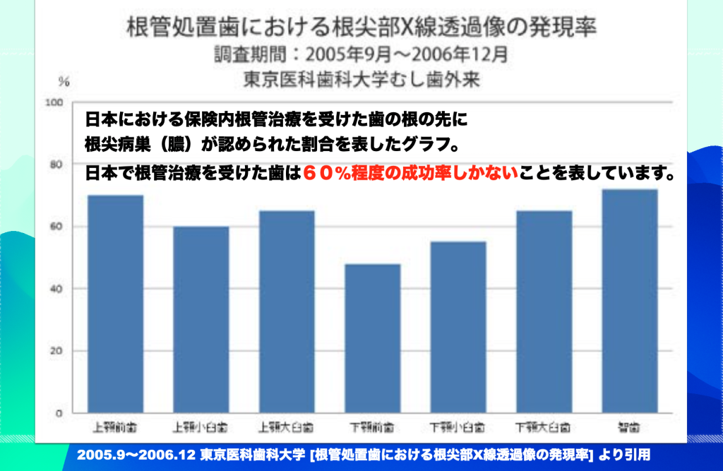 ところが、日本における保険根管治療では半分以上の割合で再根管治療(感染根管治療)になっていることが報告されています。