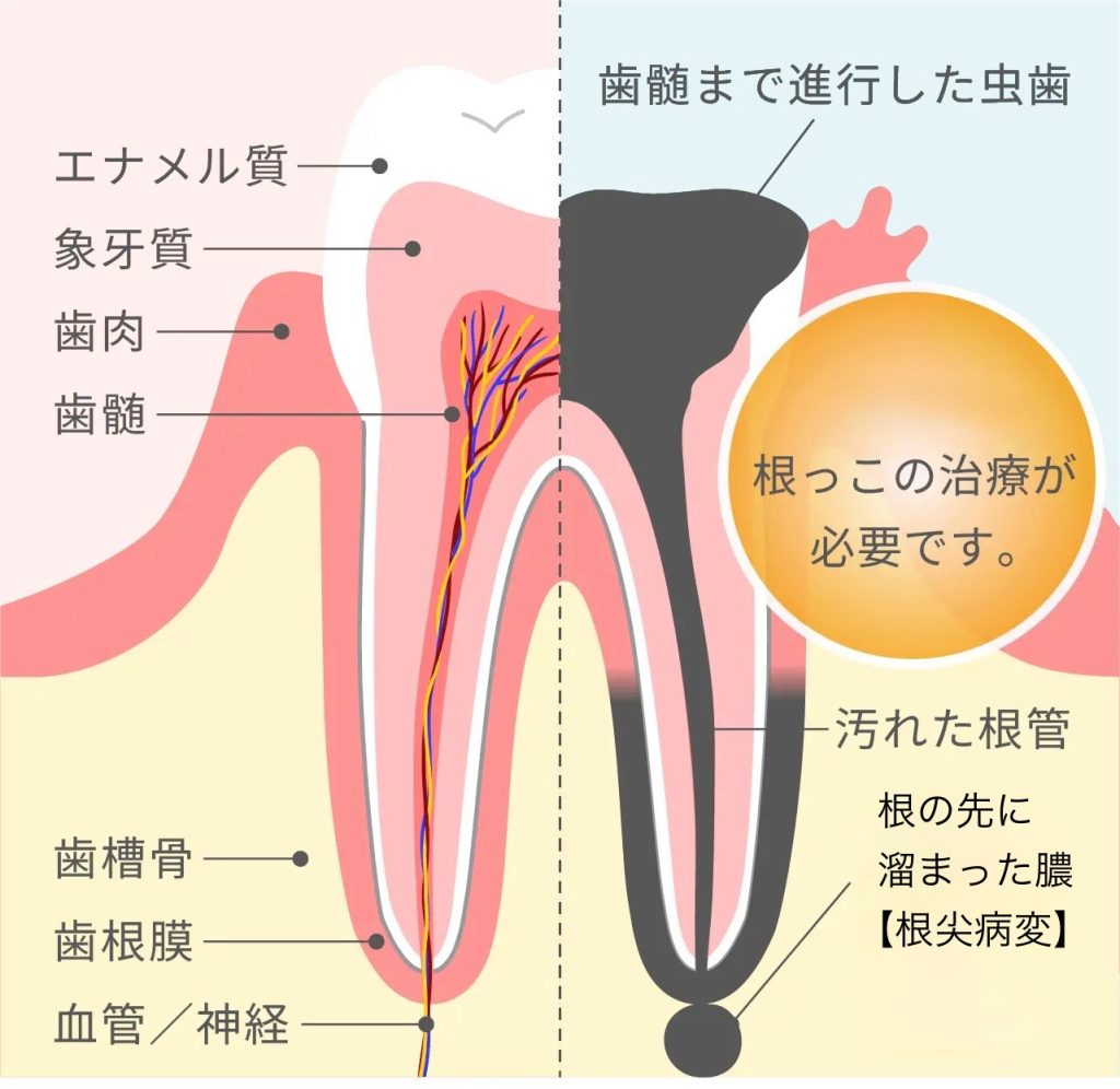 歯の中心部には「歯髄」と呼ばれる神経や血管の束が存在し、その通り道となるのが「根管」です。