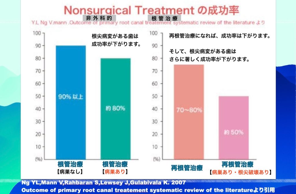 病変のない抜髄:約90%、病変のある抜髄:約80%、再根管治療:約70%であると報告されています。